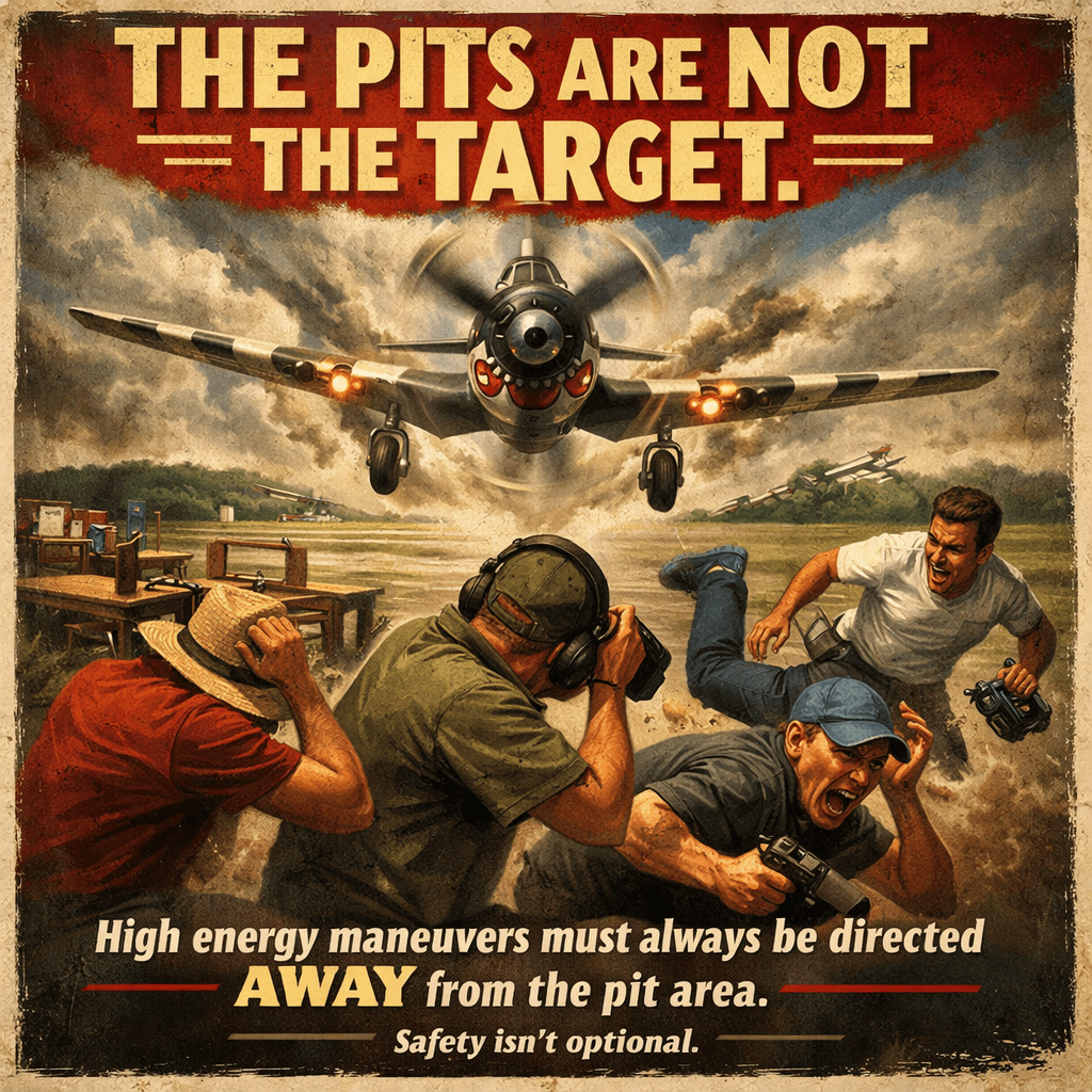 High-energy maneuvers — fast passes, snap rolls, high-G turns — must always be directed away from the pits and flight line. When a plane is coming toward the pilots or spectators at speed, reaction time disappears. Even experienced pilots can get disoriented at high closing speeds.